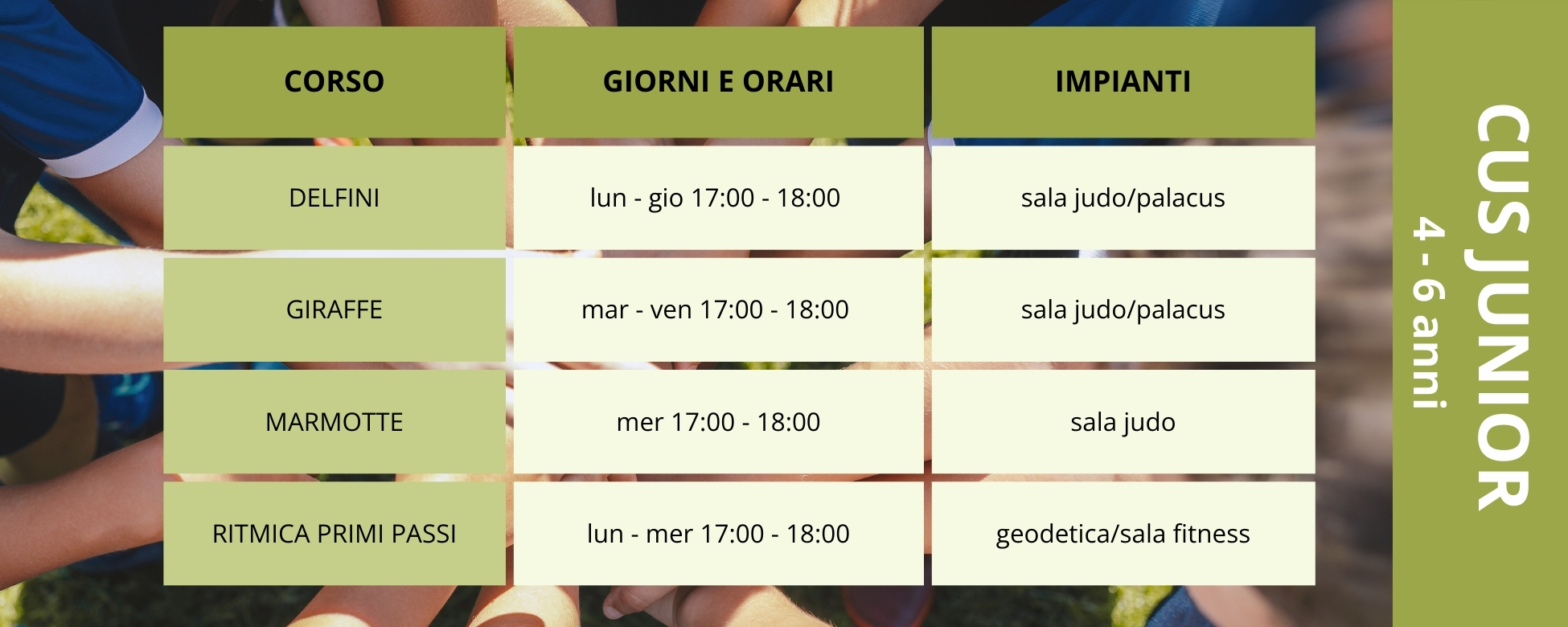 Il corso è rivolto a bambine e bambini della scuola materna. Durante le lezioni si apprendono gli schemi motori di base e si stimola la capacità di ascolto e comprensione delle indicazioni. Inoltre, vengono proposte attività ludico-motorie ispirate ai diversi sport praticati al CUS, sempre adeguate all’età dei partecipanti.