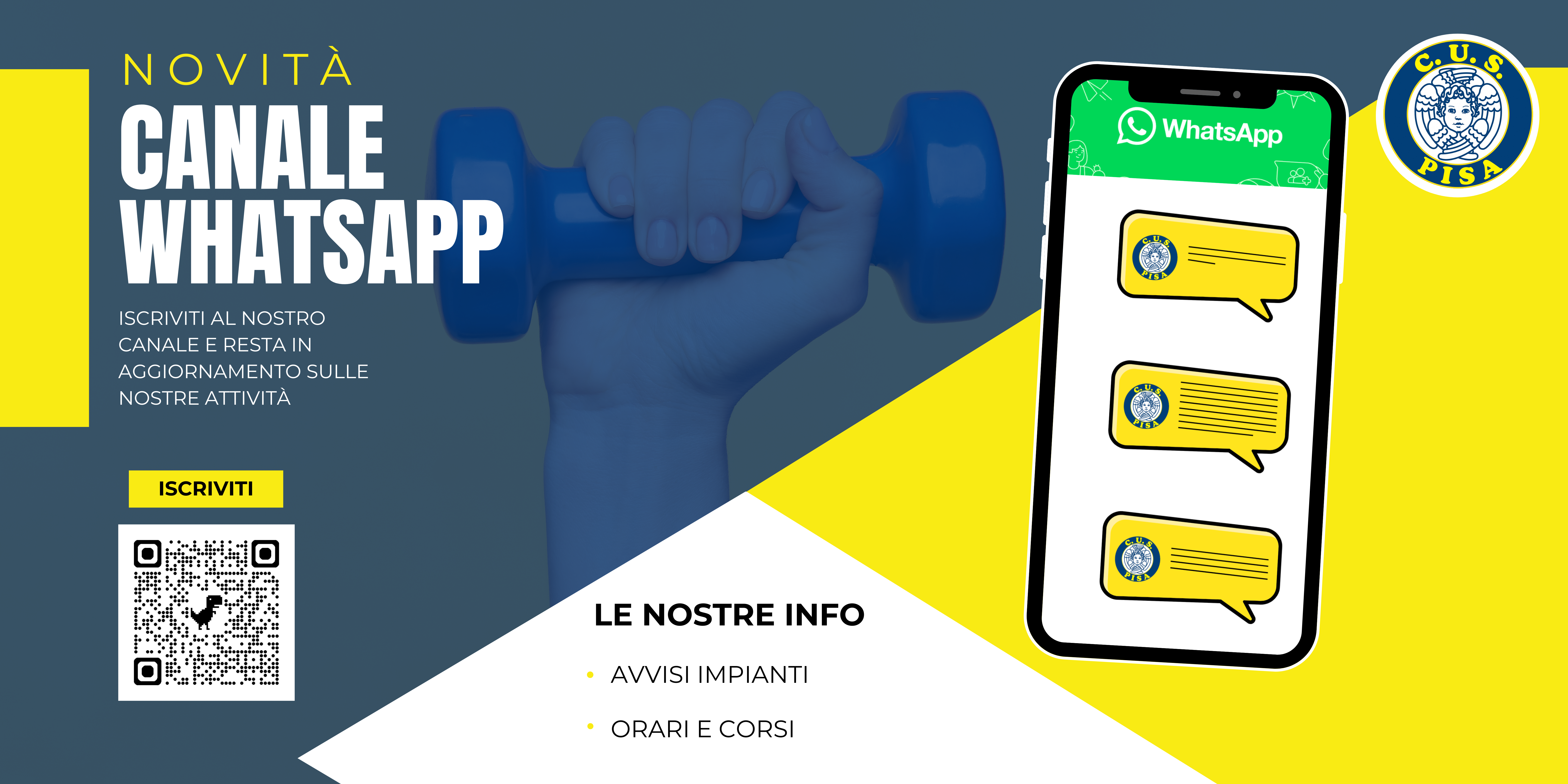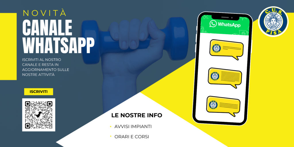 25 Novembre 2024 25 Novembre 2024Categories NewsNuovo canale whatsapp del CUS PISARimani sempre aggiornato su tutte le novità riguardanti gli impianti sportivi e i corsi universitari del CUS Pisa! Iscriviti al nostro nuovo canale WhatsApp per ricevere […]