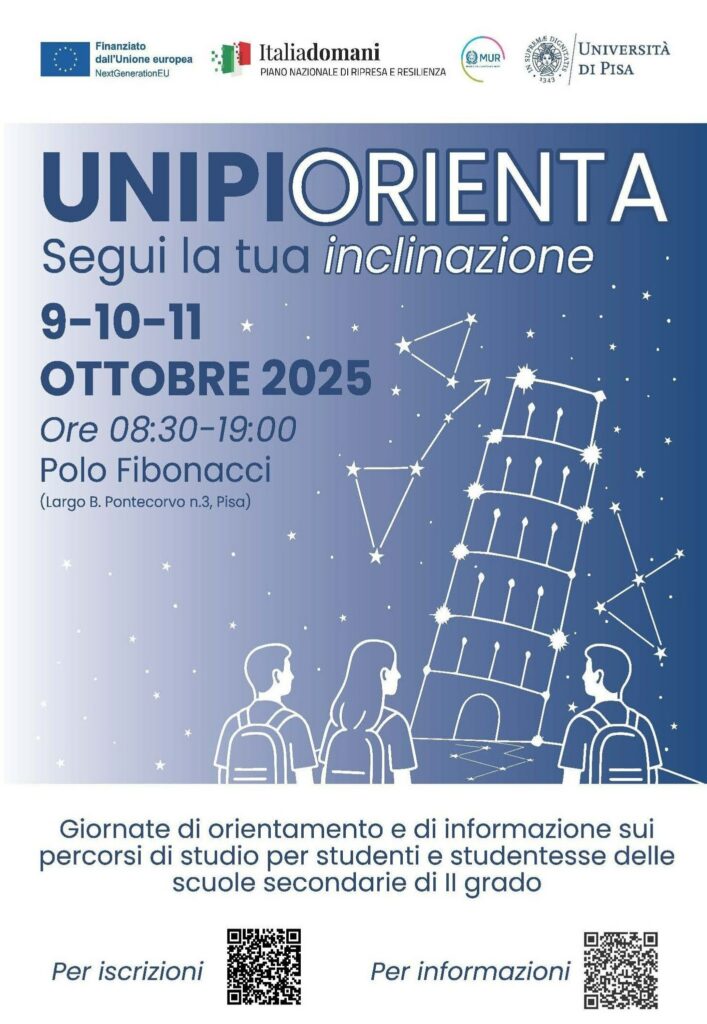 Dal 9 all’11 ottobre il Polo Fibonacci ospita “UniPi Orienta”, l’appuntamento annuale dell’Università di Pisa dedicato alle studentesse e agli studenti delle scuole superiori.